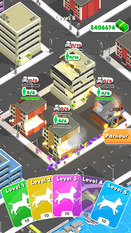 आप जितने अधिक लोगों को बचाएंगे, उतना ही अधिक आप अपने कुत्तों को सुधार सकते हैं और स्तरों में प्रगति कर सकते हैं। जितना संभव हो सके अपने कुत्तों को सुधारें। इमारतों में फंसे लोगों को बचाने के लिए सावधान रहें!