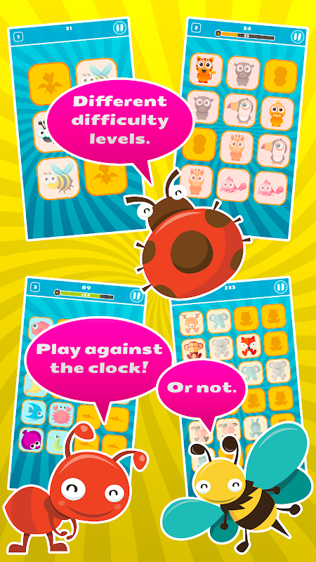 ★ 5 different levels of difficulty: Easy (3 Pairs/6 Cards), Medium (6 Pairs/12 Cards), Hard (10 Pairs/20 Cards), Tear-One's-Hair-Touch (12 Pairs/24 Cards) and Progressive (3-12 Pairs).