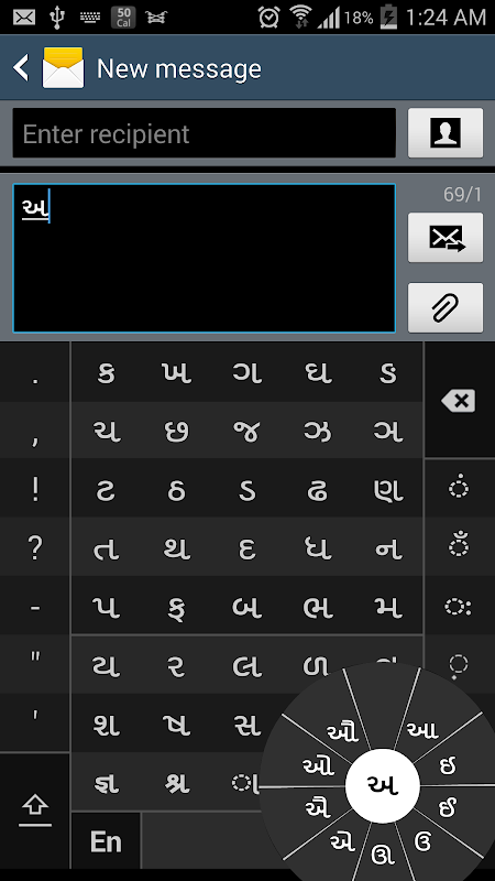 पूर्ण के स्वर ( અ, આ, ઇ, ઈ, ઉ, ઊ, એ, ઐ, ઓ, ઔ ) नीचे दाईं तरफ एक अलग चक्र में दिखाई देते हैं. कम इस्तेमाल किया स्वरों और matras ( ઽ, ઑ, ૃ, ઋ, ૄ, ૠ, ત્ર, ૅ, ૉ ) यह करने के लिए अगले हैं. अंकों, प्रतीकों और शायद ही कभी इस्तेमाल अक्षर एक पारी पर दिखाई देते हैं. तुम भी इनपुट अंग्रेजी अक्षर के लिए अस्थायी रूप से QWERTY कीपैड पर स्विच कर सकता है.