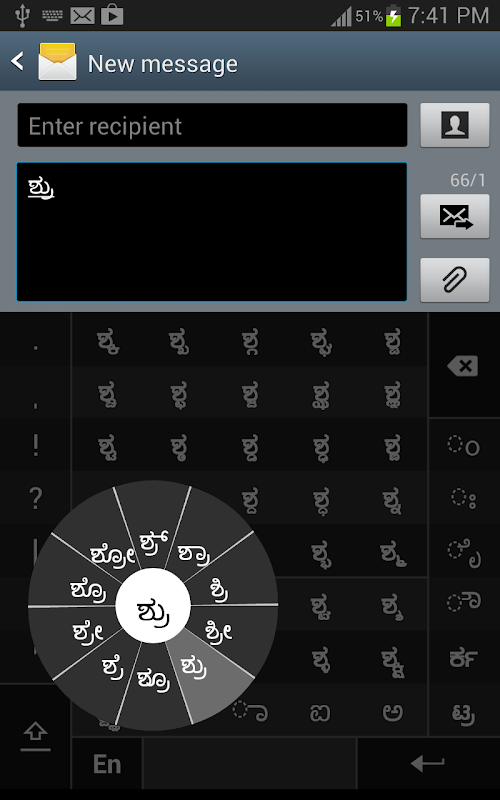 कन्नड़ में, हम अक्सर का एक संयोजन टाइप करने के लिए जरूरत है एक व्यंजन ( ಧ ) और एक MATRA ( ೊ ) जैसे ಧ + ೊ = ಧೊ । जब आप एक व्यंजन स्पर्श, व्यंजन का संयोजन और 10 लगातार Matras के साथ एक चक्र ऊपर चबूतरे ( ಧಾ, ಧಿ, ಧೀ, ಧು, ಧೂ, ಧೆ, ಧೇ, ಧೊ, ಧೋ, ಧ್ )। चक्र संभव चरित्र संयोजन की एक पूर्वावलोकन देता है। एक संयोजन का चयन करने के लिए, आप लेखनी या यह की ओर उंगली स्लाइड।