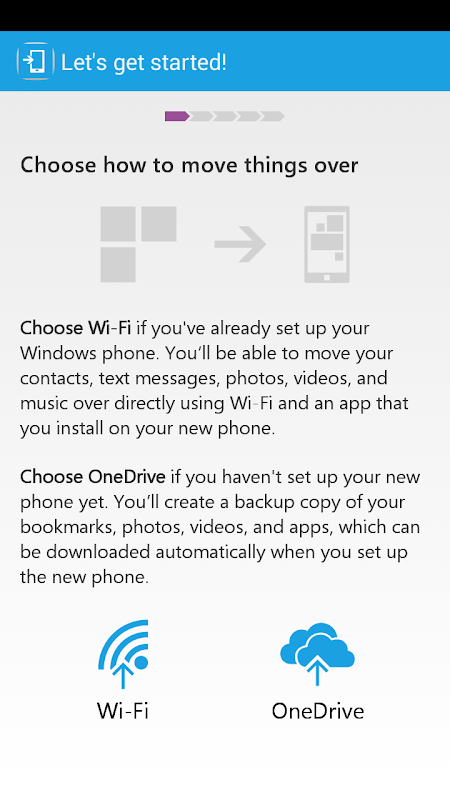(1) WiFi: if you’ve already set up your Windows phone. You’ll be able to move your contacts, text messages, photos, videos, and music over directly using virtual Wi-Fi and an app that you install on your new phone.