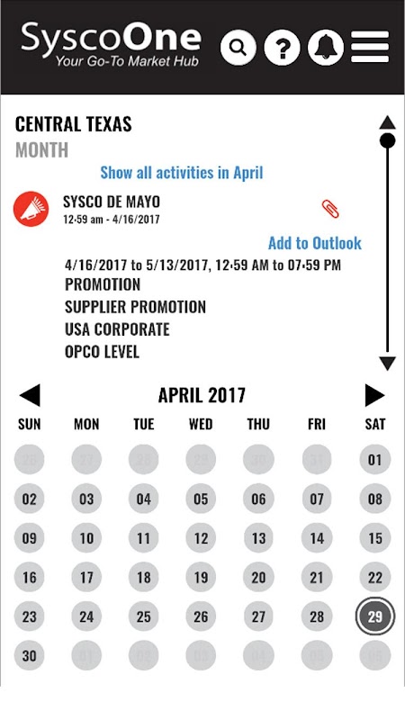 SyscoOne is a new and easy system that lets you view all Sysco promotions and activities conveniently through your computer or mobile device. It uses a responsive calendar, viewable by month, week, and day, to display core go-to-market tactics that support our strategy to accelerate local case growth. You can also view by OpCo, by Market and by type of activity. So you can easily access the information from wherever you are, and stay in the know.