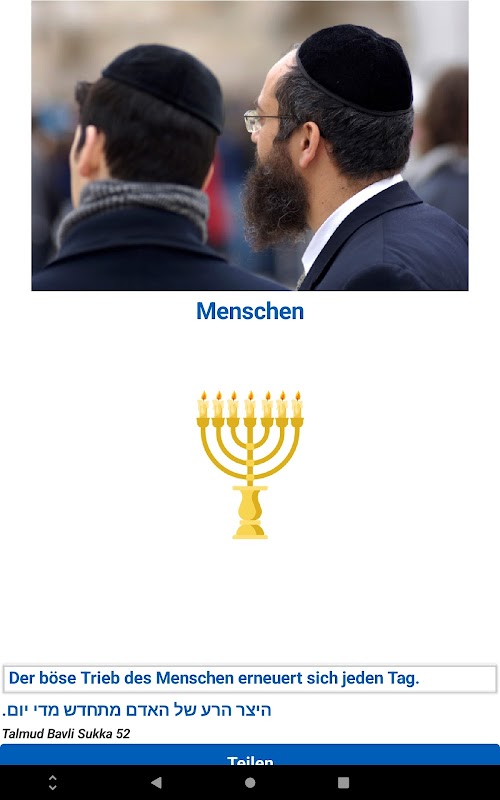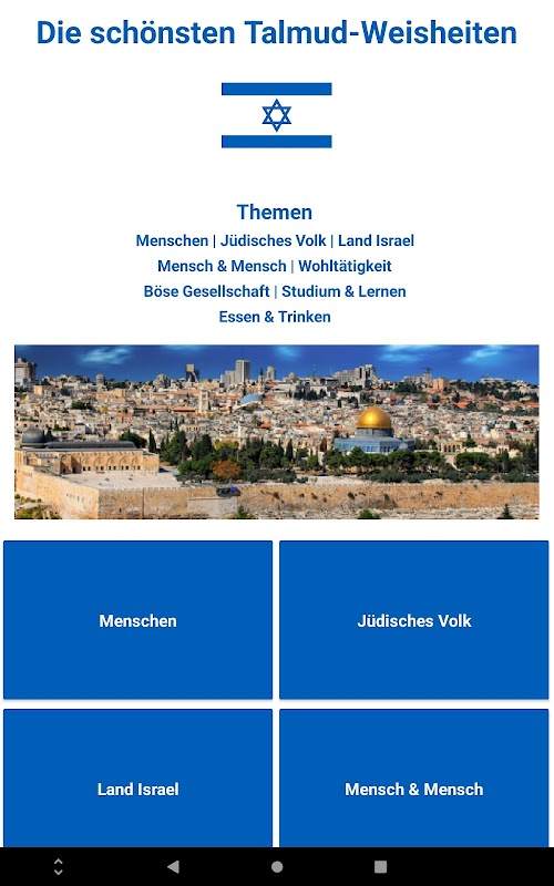 This app contains instructive texts from the Talmud. The texts are categorized into eight different areas: