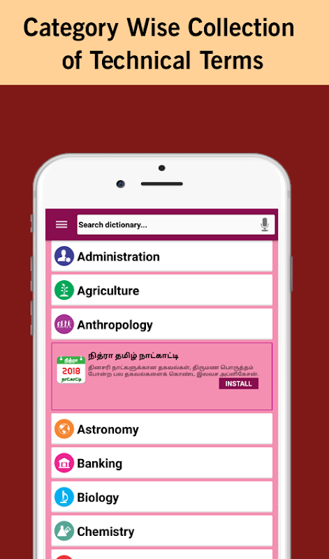 Search for English words through this Tamil Technical Dictionary and get the clear Tamil meaning on tapping the English word.