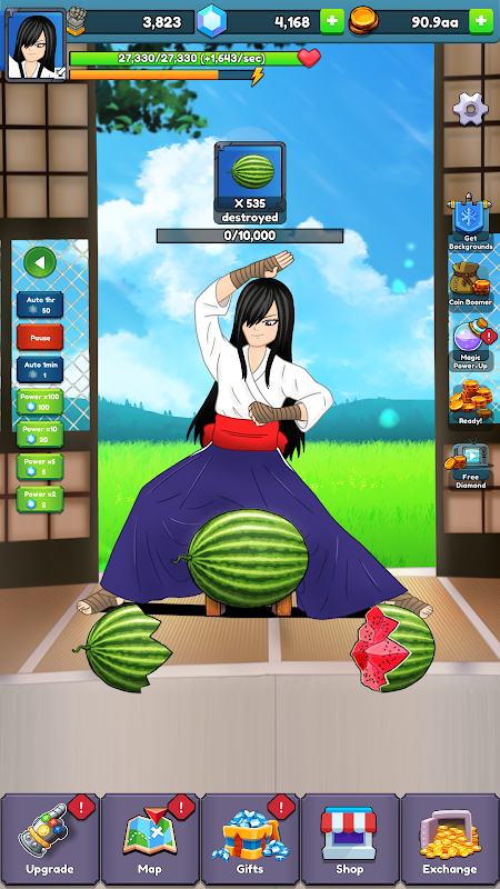अपने एनीमे चरित्र के हाथ की शक्ति, स्वास्थ्य, गति और नायक शक्ति में सुधार करने के लिए अपने सोने का उपयोग करें,
