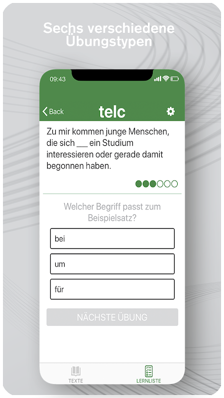 बिल्कुल तैयार! Telc Deutsch C1 Wortschatz ऐप से आप परीक्षा के लिए अपनी शब्दावली को प्रशिक्षित कर सकते हैं। अपनी पढ़ाई से संबंधित उपयुक्त पढ़ने और सुनने के ग्रंथों के साथ अपनी व्यक्तिगत शब्दावली अंतराल को बंद करें! आप जर्मन में विशेष रूप से चुनौतीपूर्ण शब्द संयोजनों को देख सकते हैं (जैसे "ध्यान में कुछ लाने के लिए" या "उपलब्ध हैं") और 6 विभिन्न प्रकार के अभ्यासों के साथ अभ्यास करें। आप अलगाव में शब्द नहीं सीखते, लेकिन उदाहरण वाक्य के साथ। आप आराम से अपने स्मार्टफोन पर सभी ऑडियो टेक्स्ट सुन सकते हैं जब आप बाहर होते हैं और इसके बारे में - इसलिए आप जर्मन सीखने के लिए बस और ट्रेन के समय का उपयोग कर सकते हैं!