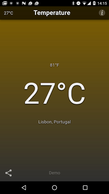 इस आवेदन में यह अपने वर्तमान स्थान का उपयोग करता है, जिसके लिए पास के एक मौसम स्टेशन द्वारा मापा वर्तमान स्थानीय बाहरी तापमान से पता चलता है.