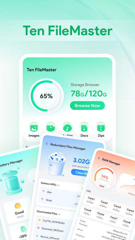 टेन फ़ाइलमास्टर फ़ाइलें ब्राउज़ करने के लिए एक छोटा उपयोगिता उत्पाद है। इसके साथ, आप न केवल अपने डिवाइस पर चित्र, वीडियो, ऑडियो, डॉक्स, ज़िप और अन्य फ़ाइलें देख सकते हैं, बल्कि पिछले तीन दिनों में उत्पन्न फ़ाइलों तक भी पहुँच प्राप्त कर सकते हैं। टेन फाइलमास्टर आपके डिवाइस को बेहतर ढंग से समझने में आपकी मदद करने के लिए कई टूल भी प्रदान करता है, जिसमें रिडंडेंट फाइल मैनेजर, लार्ज फाइल मैनेजर, डुप्लिकेट फाइल मैनेजर, रैम मैनेजर और बैटरी मैनेजर शामिल हैं। कुल मिलाकर, टेन फाइलमास्टर आपको अपने डिवाइस के बारे में अधिक जानकारी प्राप्त करने की अनुमति देता है।