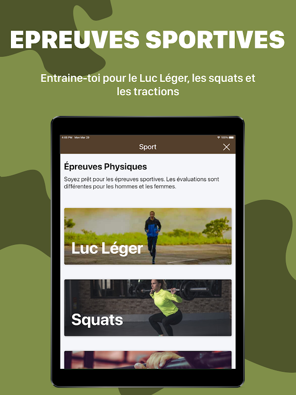 नोट: हम सेना या रक्षा विभाग से संबद्ध नहीं हैं। यह एप्लिकेशन उम्मीदवारों के लिए योग्यता परीक्षण और शारीरिक परीक्षण की तैयारी की आवश्यकता को पूरा करता है। परीक्षण किसी भी समय परिवर्तन के अधीन हैं। अधिक जानकारी के लिए फ्रांसीसी सेना की आधिकारिक वेबसाइट और अपने सीआईआरएफए सलाहकार देखें।
