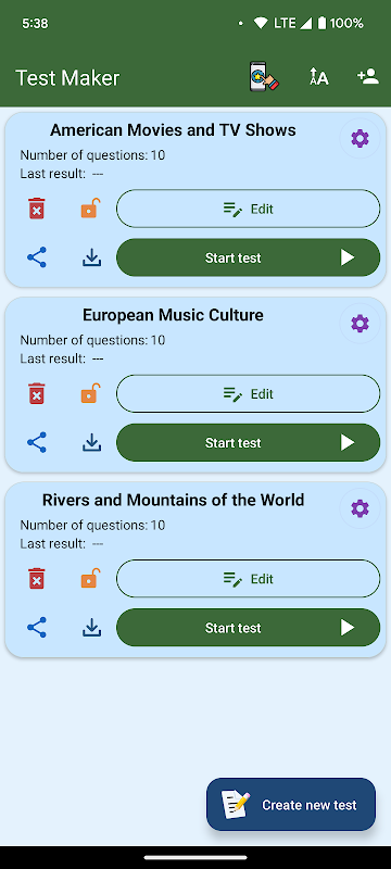 टेस्ट मेकर आपको टेस्ट फॉर्मेट में आपकी पसंद की हर चीज को याद रखने में मदद करेगा। बस परीक्षण का नाम दर्ज करें और कोई भी प्रश्न जो आप चाहते हैं जोड़ें