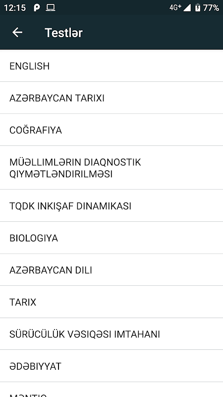 अंग्रेजी, अज़रबैजानी इतिहास, भूगोल, SSAC, जीवविज्ञान, अज़ेरी भाषा, शिक्षकों, नैदानिक मूल्यांकन, तिथि, ड्राइविंग लाइसेंस परीक्षा, साहित्य, तर्क (तर्क), भौतिकी, सूचना विज्ञान, बीजगणित, ज्यामिति, रसायन विज्ञान, YOS, मजिस्ट्रेट, दिलचस्प सवाल, पाठ्यचर्या