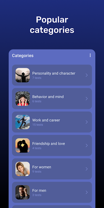 एप्लिकेशन में मनोवैज्ञानिक परीक्षणों का एक संग्रह है। इसमें पेशेवर मनोवैज्ञानिक परीक्षण और मनोरंजन दोनों शामिल हैं। आप अपने व्यक्तित्व या किसी अन्य व्यक्ति की कई दिलचस्प विशेषताएं जान सकते हैं। प्रत्येक परीक्षा में एक विवरण होता है। आपको हर स्वाद और किसी भी व्यक्ति के लिए एक परीक्षण मिलेगा।