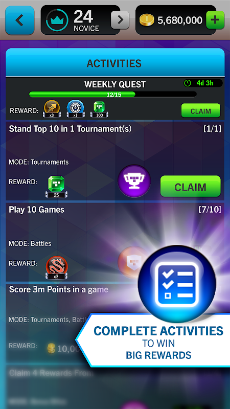 Race to reach top scores, clear a set number of lines with specific Power-Ups, or collect as many Coins as you can. Complete activities in Tournaments, Battles, Daily Challenges, and more to win awesome rewards. Plus, play mega Weekly Quests for mini bonuses as you play, and earn even bigger rewards when you finish!