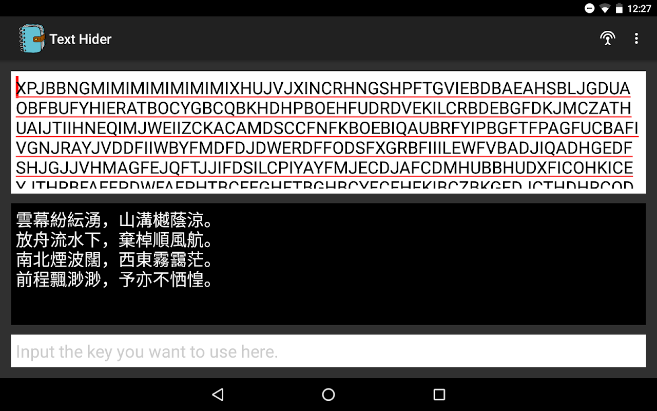 इस आवेदन को छिपाने के लिए / किसी भी पाठ दिखाएँ MagicStringHider पुस्तकालय का उपयोग करता है। आप भी अपने पाठ को बचाने के लिए एक वैकल्पिक कुंजी जोड़ सकते हैं।