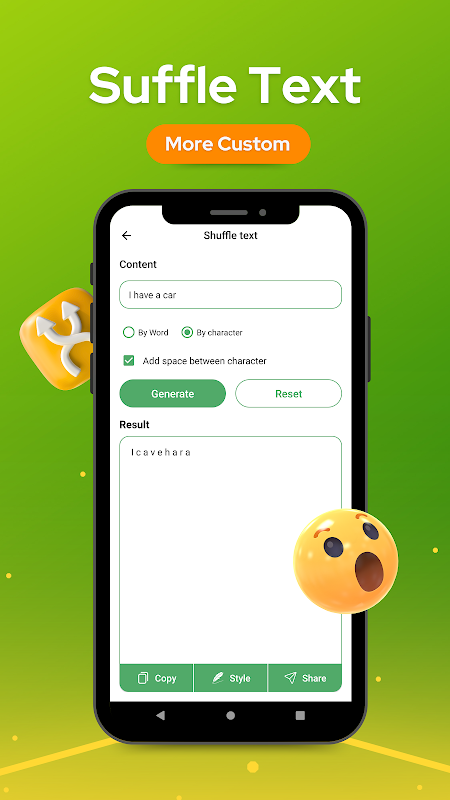 🪄**टेक्स्ट शफ़ल**: हमारी टेक्स्ट शफ़ल सुविधा के साथ चीजों को मिलाएं। चंचल और आश्चर्यजनक संदेश बनाने के लिए अपने शब्दों के क्रम को यादृच्छिक बनाएं जो आपकी बातचीत को ताज़ा और मनोरंजक बनाए रखें।