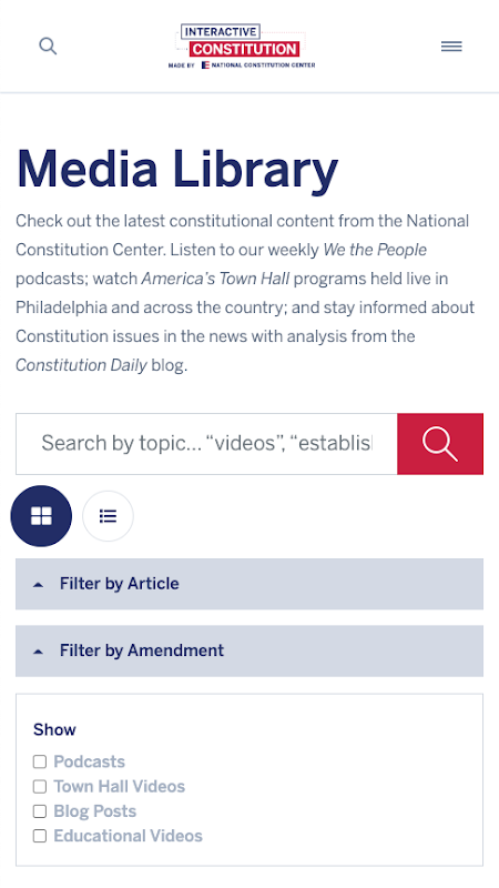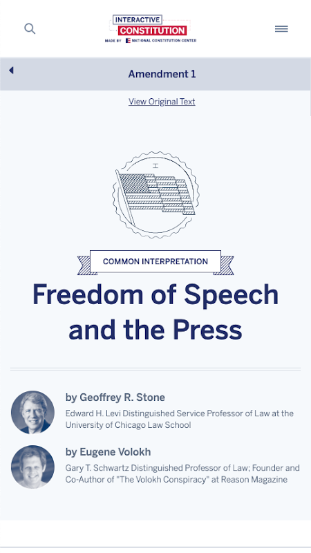 नि: शुल्क इंटरएक्टिव संविधान ऐप अमेरिकी संविधान का पूरा पाठ प्रस्तुत करता है और प्रमुख विद्वानों द्वारा निबंध प्रस्तुत करता है जो कि दार्शनिक और कानूनी दृष्टिकोणों की एक श्रृंखला में समझौते और असहमति के क्षेत्रों का विस्तार करता है। अमेरिकन कॉन्स्टिट्यूशन सोसाइटी और फेडरलिस्ट सोसाइटी के साथ साझेदारी में राष्ट्रीय संविधान केंद्र द्वारा बनाया गया, यह गैर-पक्षपाती संसाधन कॉलेज बोर्ड द्वारा अपने उन्नत प्लेसमेंट इतिहास और सरकारी पाठ्यक्रमों में चित्रित किया गया है। जॉन टेम्पलटन फाउंडेशन के अनुदान से इंटरएक्टिव संविधान को संभव बनाया गया था।