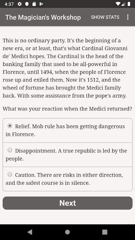 द मैजिशियन्स वर्कशॉप केट हार्टफील्ड द्वारा लिखित 190,000 शब्दों का एक इंटरैक्टिव ऐतिहासिक काल्पनिक उपन्यास है, जहाँ आपकी पसंद कहानी को नियंत्रित करती है। यह पूरी तरह से टेक्स्ट-आधारित है - बिना ग्राफिक्स या ध्वनि प्रभाव के - और आपकी कल्पना की विशाल, अजेय शक्ति द्वारा संचालित है।
