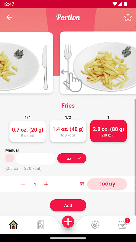 - दिन भर में, आप जो भोजन खा रहे हैं उसे जोड़ सकते हैं और भोजन चित्रों का उपयोग करके उन हिस्सों का चयन कर सकते हैं जो आप खा रहे हैं। एक छोटा गेज आपको दिखाता है कि उस दिन के लिए आपके पास खर्च करने के लिए कितनी कैलोरी बची है।