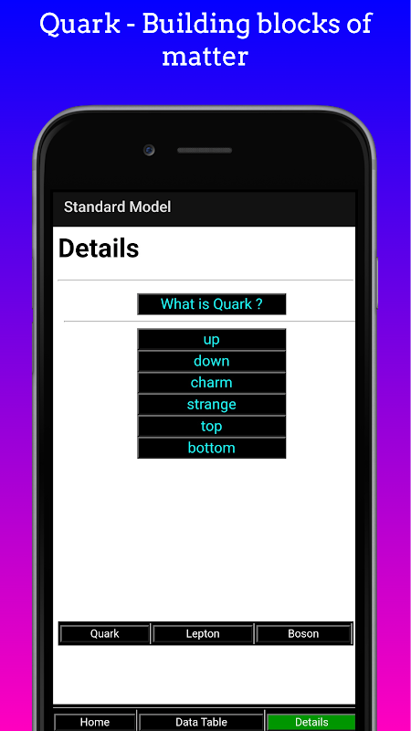 एप्लिकेशन में प्रतीक, प्रकार, द्रव्यमान, चार्ज, स्पिन, खोजा गया वर्ष, पीढ़ी और प्राथमिक कणों के बारे में कई और जानकारी होती है।