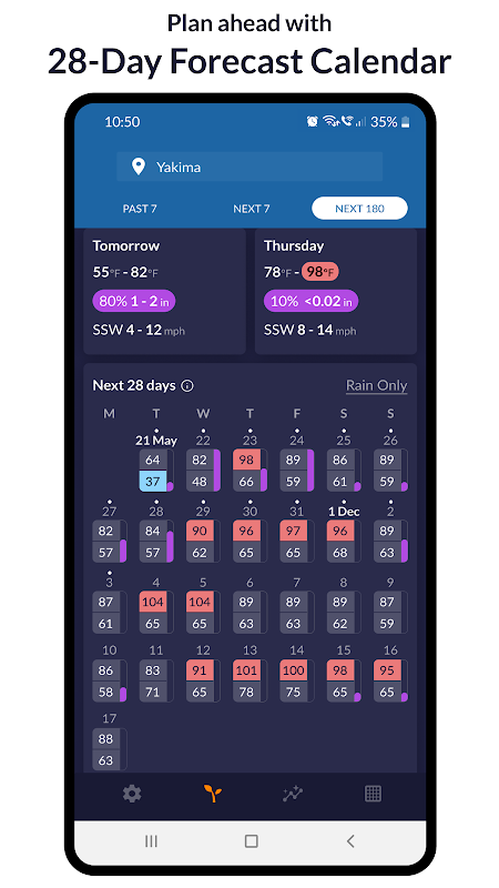 • पिछले 7 दिनों, अगले 14 दिनों, अगले 28 दिनों और अगले 180 दिनों के मौसम पूर्वानुमानों का उपयोग करके अल्पकालिक से दीर्घकालिक योजनाएं बनाएं।
