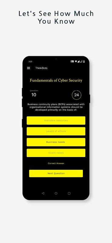 साइबर सुरक्षा में रुचि रखते हैं? थिंक बॉट्स एक क्विज़ ऐप है, जो आपको क्विज़ हल करने के माध्यम से ठीक वैसा ही सीखने में मदद करता है। थिंक बॉट्स आपको सीखने के साथ-साथ साइबर सुरक्षा में आपके ज्ञान की जांच करने में मदद करेंगे। ऐप में साइबर सुरक्षा से संबंधित कई क्विज़ हैं, जिनमें सूचना सुरक्षा बुनियादी बातों, मोबाइल एप्लिकेशन सुरक्षा, अवसंरचना सुरक्षा, साइबर सुरक्षा जागरूकता और बहुत कुछ शामिल हैं।