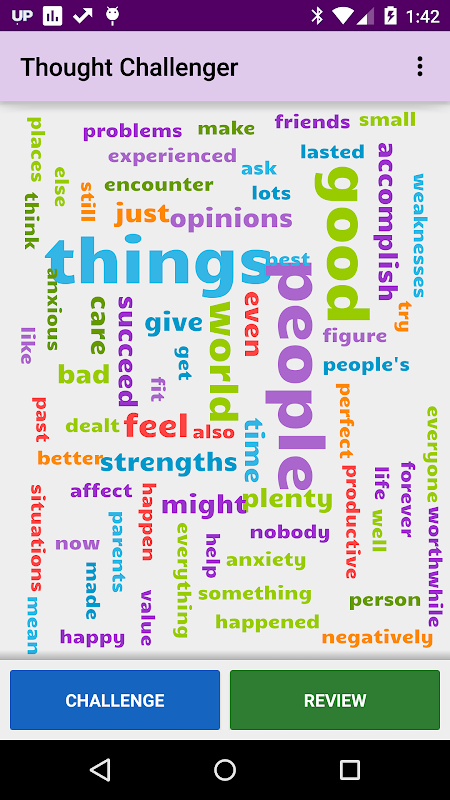 Thought Challenger helps you gain control of how you feel and what you do by teaching you to notice and challenge negative and unhelpful thoughts. Thought Challenger is built on cognitive behavioral therapy - a structure that has been found in clinical studies to be useful in examining negative thoughts and reframing them to help you feel better and do the things you want to do.