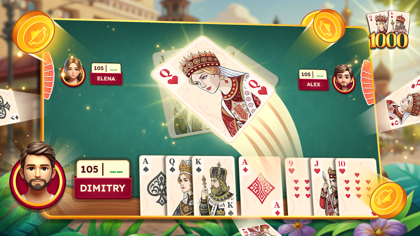 **उद्देश्य**: बोलियों, ट्रिक्स और विवाहों के माध्यम से 1,000 अंक तक पहुँचने वाले पहले व्यक्ति बनें।