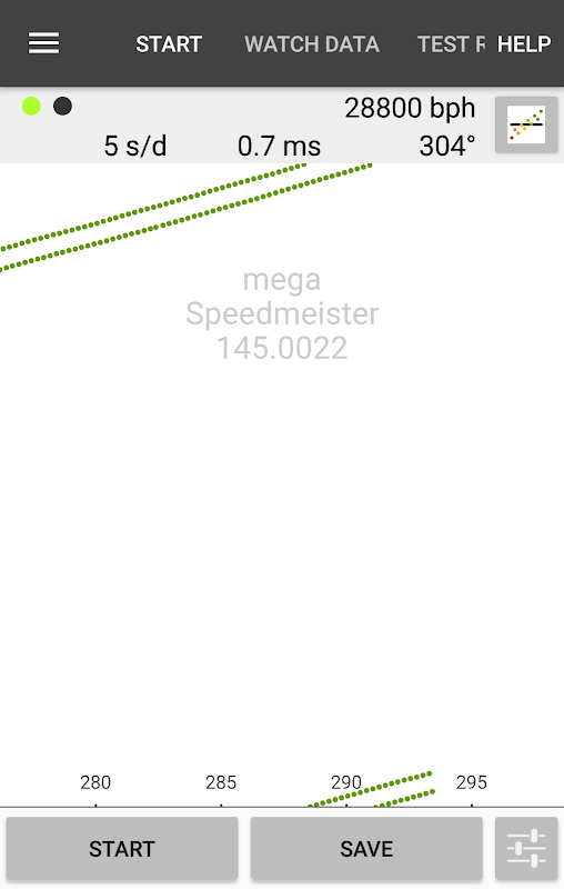 TICKOPRINT® मुफ़्त सेकंड/24 घंटों में सटीकता विचलन को प्रदर्शित करता है और आरेख रेखा में अंतराल द्वारा हरा त्रुटि दिखाता है। उपयोगकर्ता-चयन योग्य मूल्यों के साथ एक "टिक" सिमुलेशन TICKOPRINT के कार्यशील मॉडल को दर्शाता है। सभी परीक्षणों को मोबाइल डिवाइस पर संग्रहीत किया जा सकता है और परीक्षण के परिणामों की जांच के लिए फिर से चलाया जा सकता है। "रनिंग पेपर स्ट्रिप" दिशा चयन योग्य (क्षैतिज या लंबवत) है।