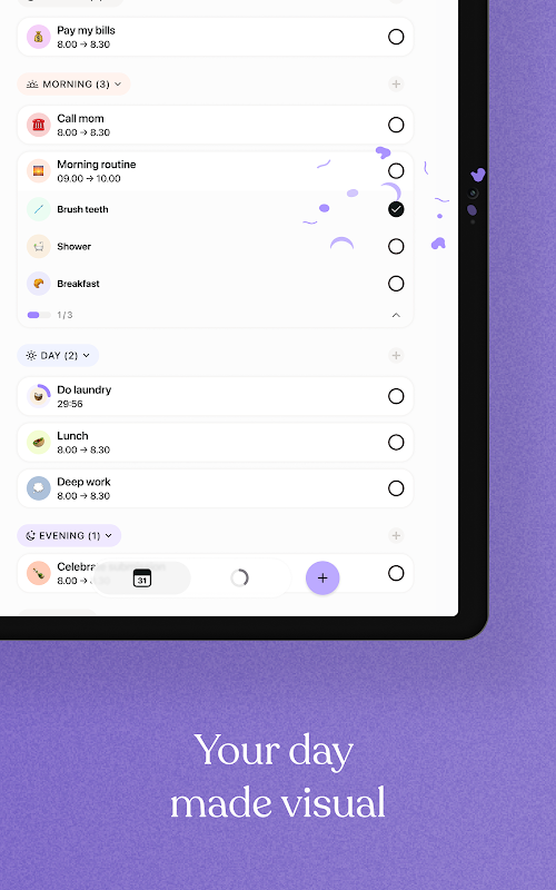 तिमो कार्यों और कार्यसूची को एक दृश्य दैनिक योजना में बदलकर निर्णय लेने की थकान को कम करने में मदद करता है। आप अपने दिन के अनुसार अपना शेड्यूल एडजस्ट कर सकते हैं, नियमितता बनाए रखने के लिए रिमाइंडर का उपयोग कर सकते हैं और ध्यान भटकाने वाली चीजों को कम करने के लिए फोकस टाइमर पर भरोसा कर सकते हैं। चाहे आप काम, पढ़ाई या रोजमर्रा की जिंदगी की योजना बना रहे हों, Tiimo आपको बिना किसी तनाव के महत्वपूर्ण चीजों पर ध्यान केंद्रित रखने में मदद करता है।