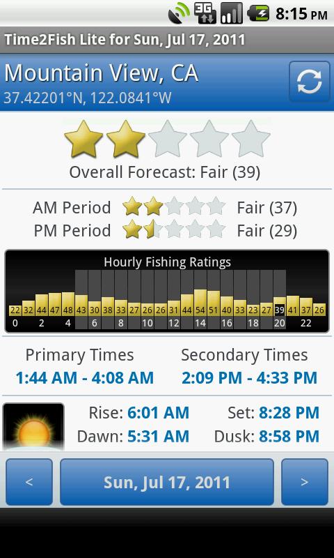 Shows daily/hourly fishing forecast, sunrise/sunset & moon phase.