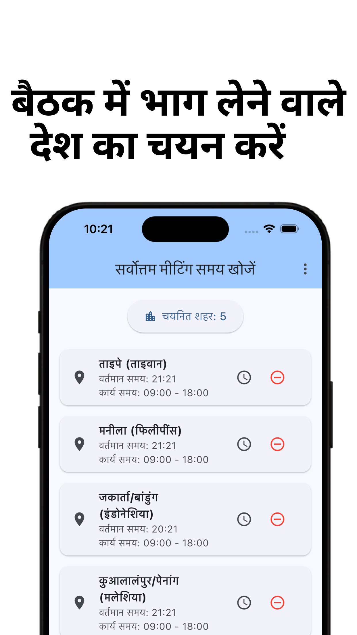 उपयोगकर्ता प्रत्येक देश के लिए कार्य समय सेट कर सकते हैं और समय क्षेत्र के अंतर से उत्पन्न परेशानी को कम कर सकते हैं।