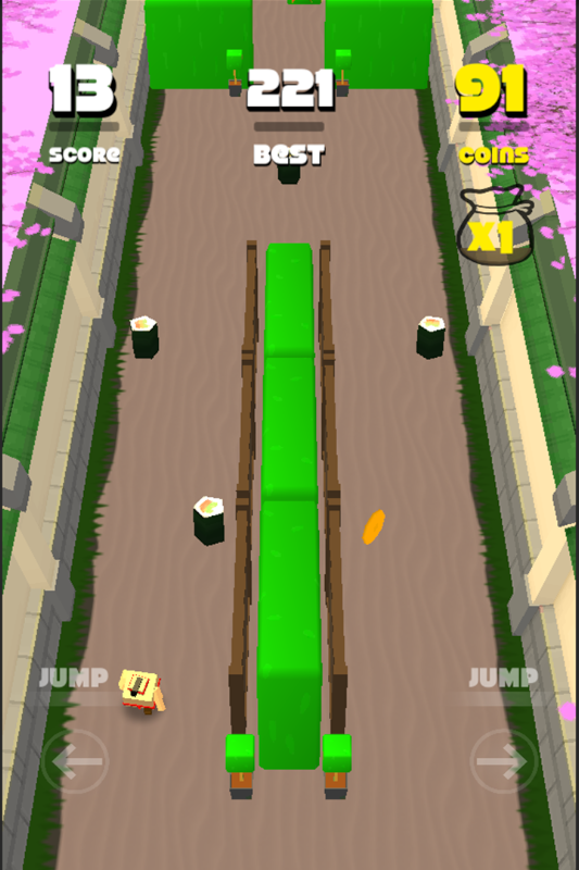 Eat sushi to earn points while dodging deadly SPIKES and vaulting over deadly SHRUBS.