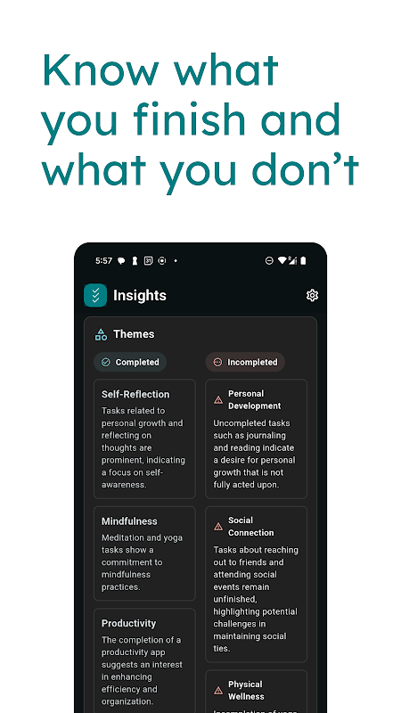 अधिकांश कार्य सूचियाँ बहुत लंबी होती हैं। 3 चीजें इसे सरल बनाती हैं - आप प्रत्येक दिन ध्यान केंद्रित करने के लिए सिर्फ़ तीन कार्य चुनते हैं (या AI द्वारा सुझाए जाते हैं)। बड़ा हो या छोटा, दिन में तीन जीत सब कुछ बदल सकती हैं।