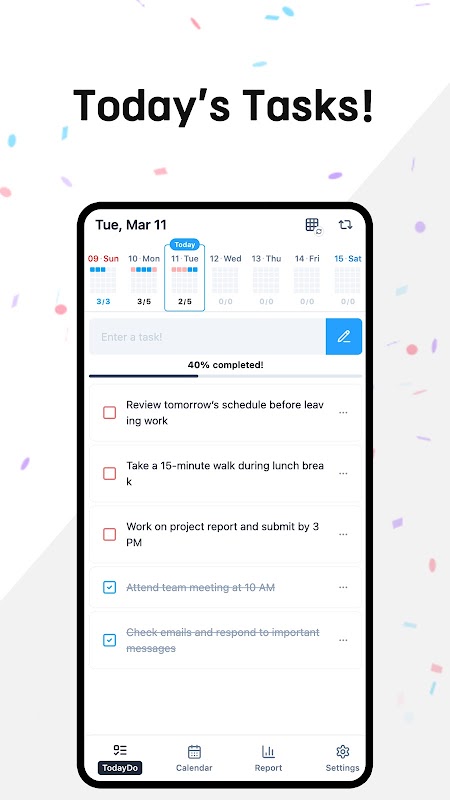 अब और अव्यवस्थित कार्य सूचियाँ नहीं! यह न्यूनतम कार्य करने वाला ऐप आपको केवल आज के कार्यों पर ध्यान केंद्रित करने में मदद करने के लिए डिज़ाइन किया गया है। भविष्य के शेड्यूल के बिना, आप अपने दैनिक कार्यों को तुरंत व्यवस्थित कर सकते हैं और उन्हें आसानी से पूरा कर सकते हैं।