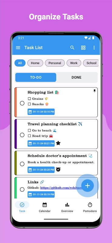 अंतर्निहित पोमोडोरो टाइमर के साथ अपनी उत्पादकता बढ़ाएँ। समय-अवरुद्ध तकनीकों का उपयोग करके कार्यों पर ध्यान केंद्रित करें, और टाइमर पूरा होने पर कंपन के साथ एक अधिसूचना प्राप्त करें।