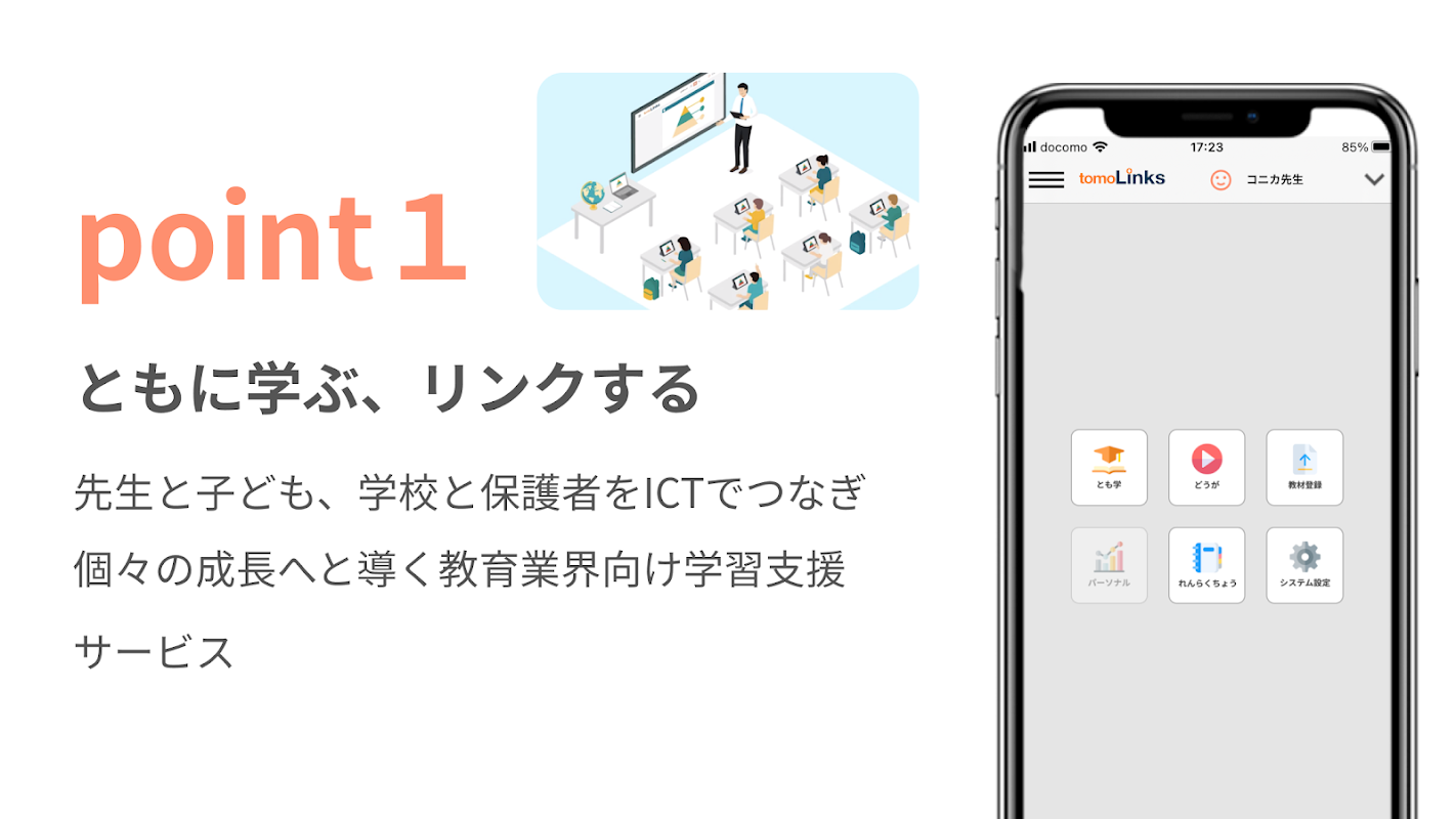 tomoLinks एक सीखने में सहायता सेवा है जो स्कूली जीवन के लिए आवश्यक चीजों को एकीकृत करती है, जैसे कि संपर्क पुस्तकें, सहयोगी शिक्षा और दूरस्थ शिक्षा।