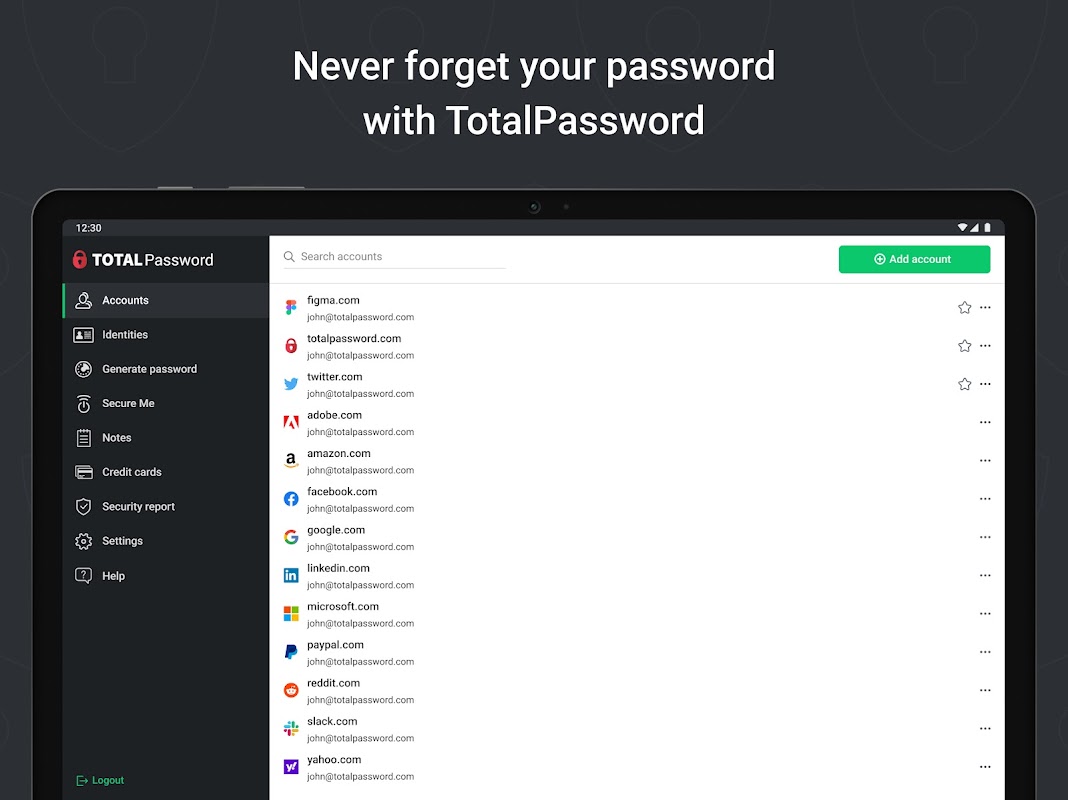 टोटल पासवर्ड एक स्मार्ट पासवर्ड मैनेजर है, जो व्यस्त लोगों के लिए आदर्श है जिनके पास सभी लॉगिन और पासवर्ड याद रखने का समय नहीं है। हम गहन एकीकृत एन्क्रिप्शन के साथ आपके सभी डेटा और ऑनलाइन गोपनीयता का प्रबंधन और सुरक्षा करते हैं। 5.0 तक के पुराने संस्करणों के लिए बैकवर्ड समर्थन के साथ एंड्रॉइड संस्करण 8.0+ पर एंड्रॉइड ऑटो-फिल सेवा का उपयोग करके पासवर्ड तुरंत भरें।