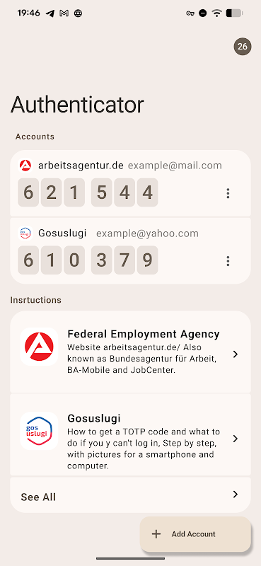 TOTP Authenticator generates 6-digit TOTP codes. Websites (for example Arbeitsagentur, Gosuslugi etc.) request these codes. This security feature is called two factor authentication or 2FA.