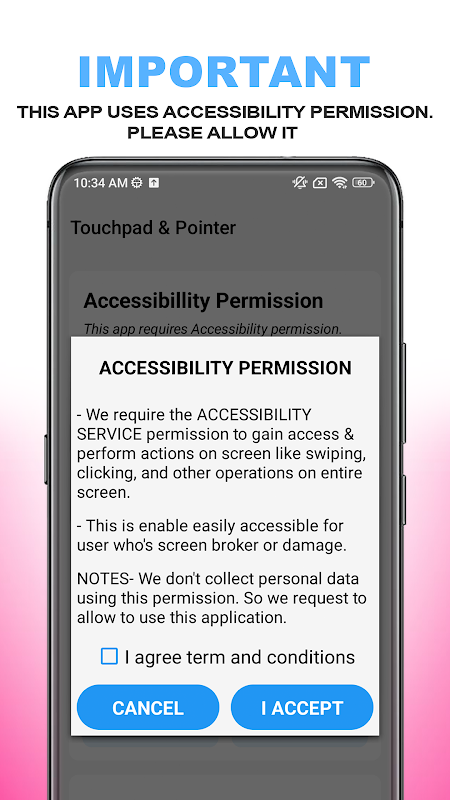 हमें उपयोगकर्ता को कर्सर का उपयोग करके स्क्रीन पर क्लिक करने और इस माउस पॉइंटर ऐप के साथ फोन स्क्रीन पर आसानी से नेविगेशन की अनुमति देने के लिए एक्सेसिबिलिटी अनुमति की आवश्यकता है।