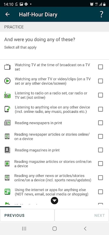 TouchPoints एक मार्केट रिसर्च एप्लिकेशन है जो अध्ययन प्रतिभागियों के व्यवहार और विभिन्न मीडिया के उपयोग को कैप्चर करता है। ऐसा करने के लिए हम प्रतिभागियों को 7 दिन की अवधि के लिए हर आधे घंटे में सर्वेक्षण प्रश्न पूरा करने के लिए कहते हैं। जब किसी प्रतिभागी का उपकरण इंटरनेट से जुड़ा होता है, तो उनके उत्तर और उपयोग की जानकारी विश्लेषण के लिए एक दूरस्थ सर्वर पर सुरक्षित रूप से भेजी जाती है।