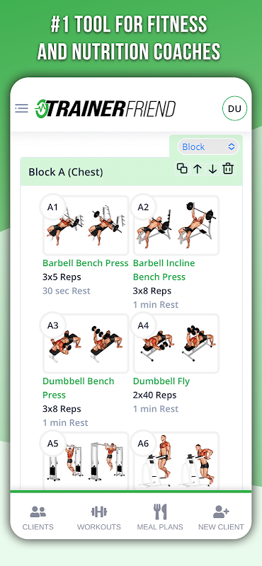 प्रशिक्षकों के लिए अपने ग्राहकों के लिए भोजन और कसरत योजना बनाने के लिए सहज उपकरण।