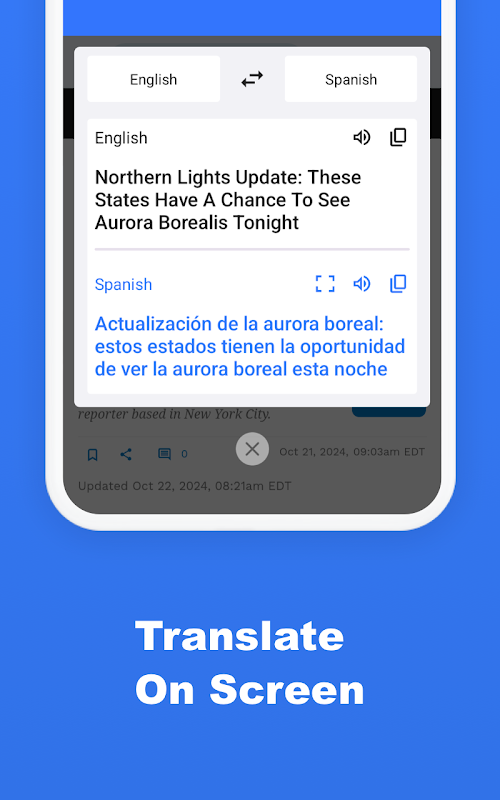 • ऐप्स में अनुवाद — फ़्लोटिंग बबल का उपयोग करें और WhatsApp, Messenger या किसी भी ऐप में सीधे टेक्स्ट का अनुवाद करें।