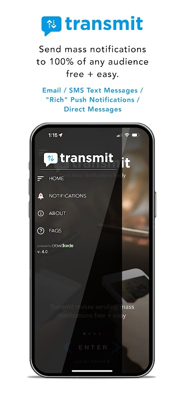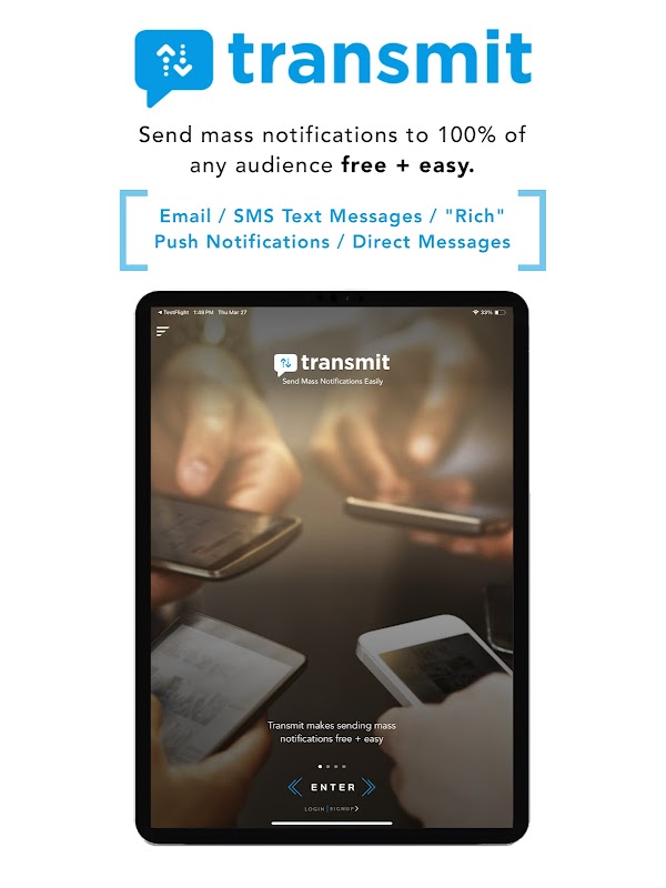 ट्रांसमिट हमारे क्रांतिकारी 4-इन-1 मैसेजिंग सिस्टम का उपयोग करके किसी भी 100% दर्शकों को बड़े पैमाने पर सूचनाएं भेजना मुफ़्त + आसान बनाता है जो आपको एक संदेश भेजने की अनुमति देता है, जो इसके माध्यम से वितरित होता है: