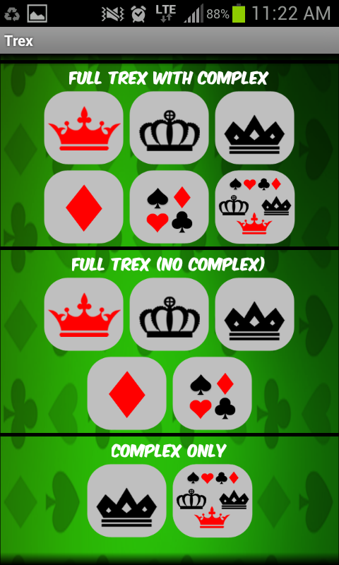 Call it Trex , Trix , Tricks, or even Treks , at the end it is the best cards game played. As asked by many people, I am providing a FREE limited version of the full version of TREX, the best one. It uses many strategic rules making the players very intelligent and challenging to play against. Moreover, the players don't cheat. It's all strategies and rules. It is even more intelligent and smarter than the iphone trex game.