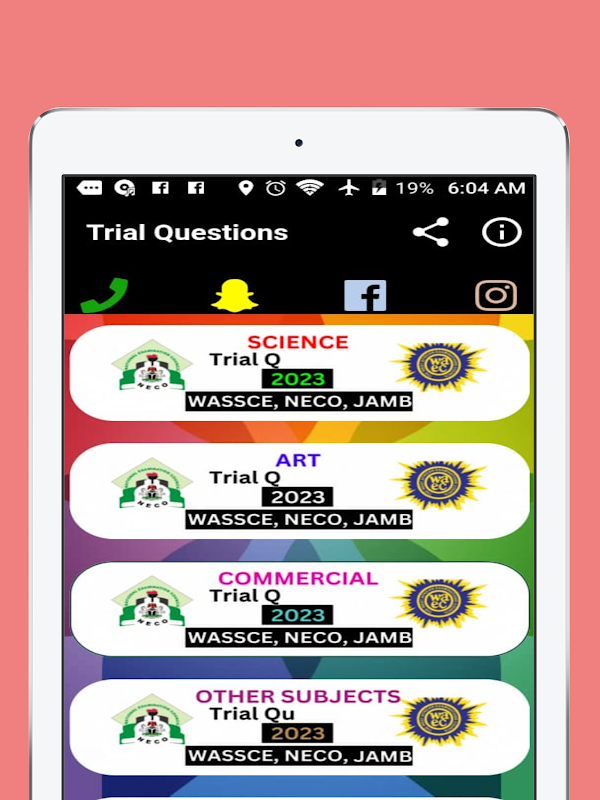 इस ऐप में 2023 उम्मीदवारों के लिए WASSCE, NECO और JAMB परीक्षण प्रश्न शामिल हैं।