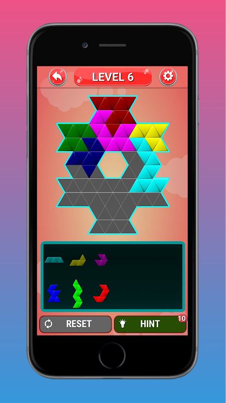 - चुनौतीपूर्ण गेमप्ले: विभिन्न रंगीन ब्लॉकों का उपयोग करके नीले त्रिकोण ग्रिड को भरें। प्रत्येक स्तर एक अनूठी पहेली प्रस्तुत करता है जो आपकी बुद्धि और रणनीतिक सोच का परीक्षण करेगा।