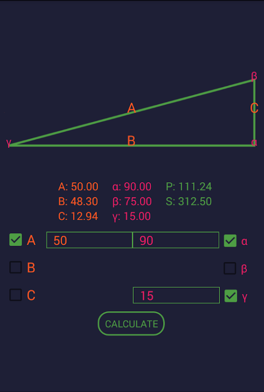 A simple application for calculating the angles and sides of an equilateral, equilateral, right triangle on existing sides and corners, as well as calculating the area and perimeter with a clear graphic display!