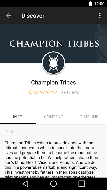 Champion Tribes is a group-based experience giving fathers a plan to raise their middle school sons into men of character. Together, a tribe is formed with other fathers navigating this critical time with their sons. As a group, twelve gatherings take place. During these gatherings, Champion Tribes provides Dads with guidance for the gathering, activities, lessons on a digital platform, and structure to create powerful moments with their sons. These moments form the context for fathers to connect with their sons in life changing ways. Conversations with purpose take place and values can be imparted. Ultimately, it's about celebrating a sons growth to manhood and laying the foundation for him to be a Champion in life.