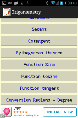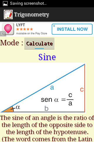 त्रिकोणमिति आप गणना प्रदर्शन और अपनी उंगलियों त्रिकोणमिति के सबसे महत्वपूर्ण अवधारणाओं पर है करने के लिए अनुमति देता है. आप त्रिकोणमिति कार्यों की अद्भुत रेखांकन उत्पन्न कर सकते हैं.