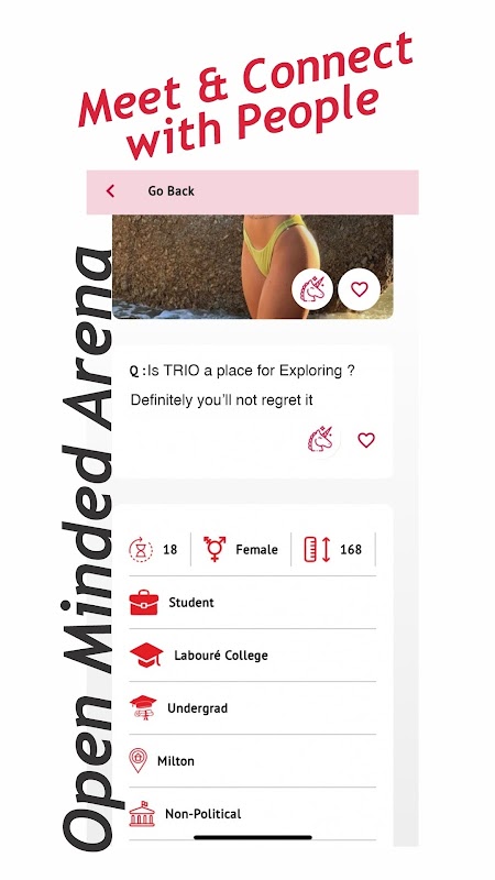 ज़्यादातर प्लेटफ़ॉर्म के उलट, Trio मैसेजिंग की कोई सीमा नहीं लगाता। खुलकर अपनी बात कहें। अपनी इच्छाओं को साझा करें। बिना किसी फ़िल्टर के बातचीत में शामिल हों - और इसे बिना किसी दैनिक सीमा या ज़बरदस्ती अपग्रेड के दबाव के करें। यह सिर्फ़ मैसेजिंग नहीं है। यह आपके तरीके से जुड़ाव है।
